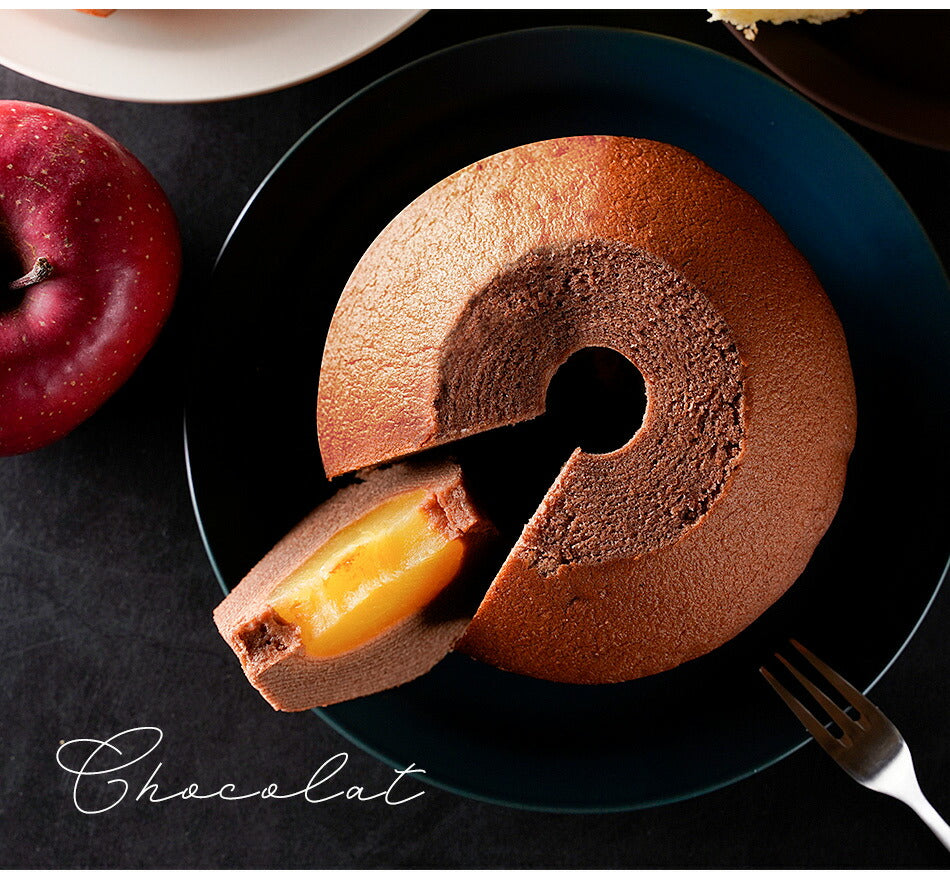 | みずみずしいシャリシャリのリンゴ1個丸ごとバームクーヘンの生地で包み込みました。リンゴの水分が生地に移り、今までのものと違ったシットリとした食感を堪能いただけます。 | |